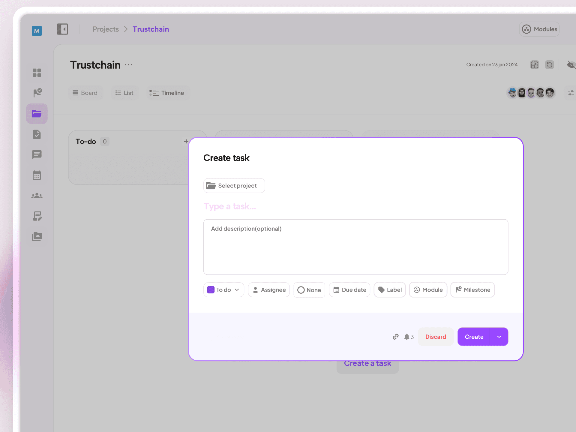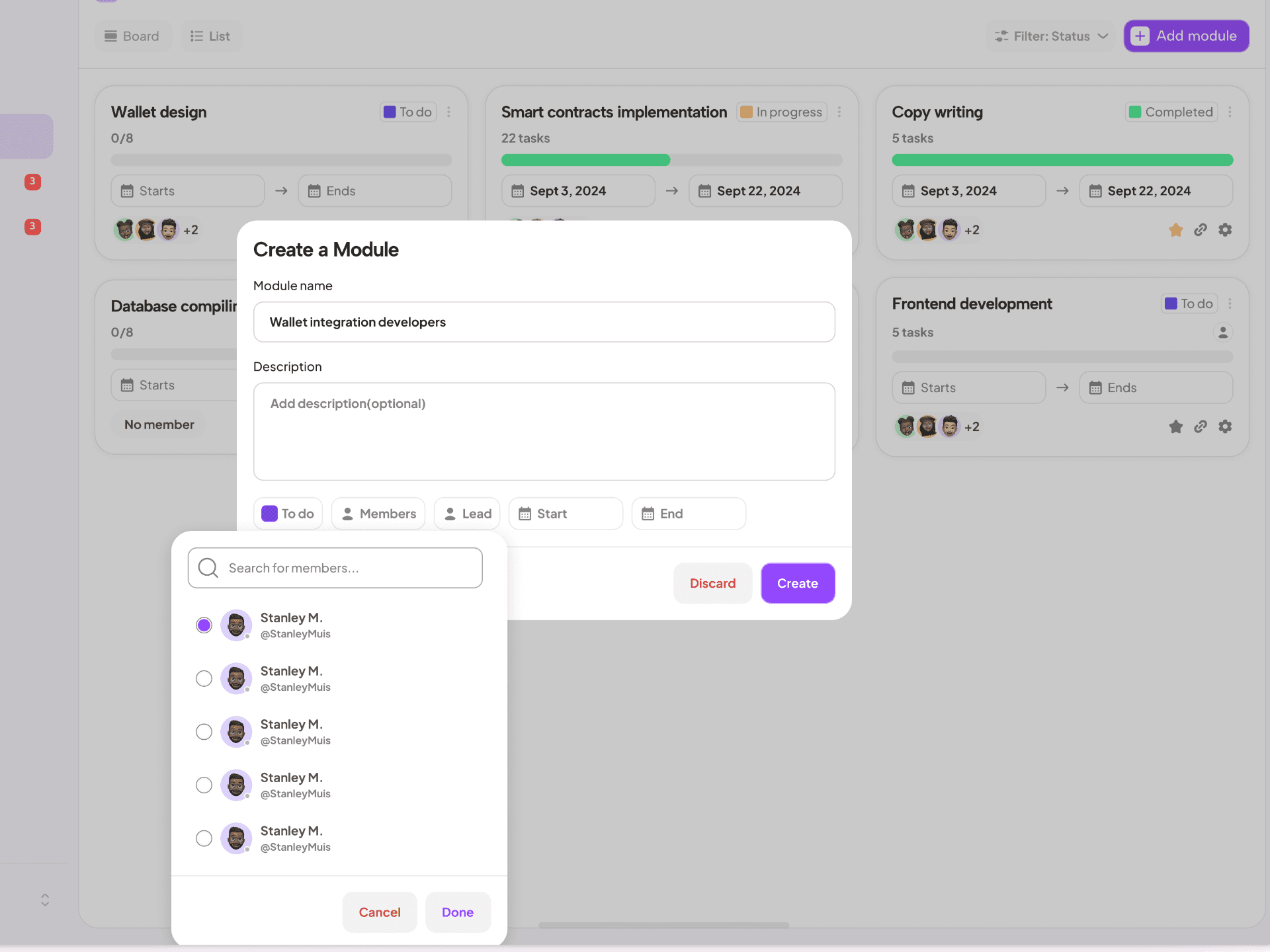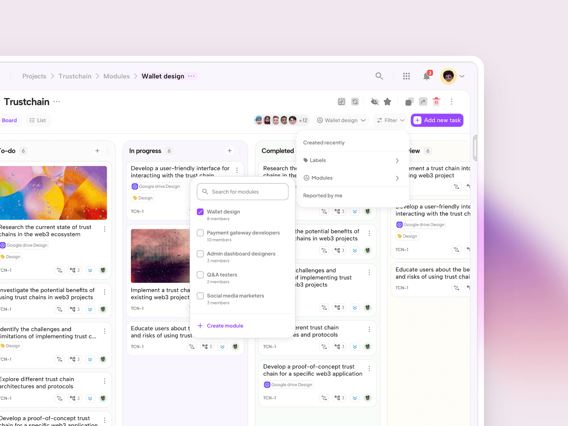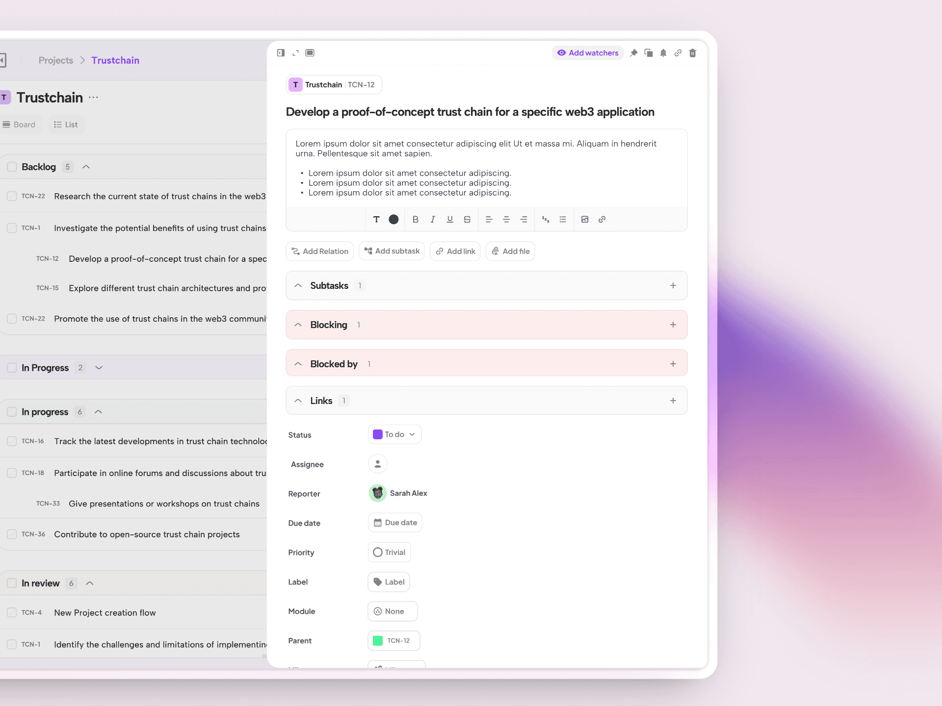 Detailed Task Cards: Include deadlines, assignees, priority levels, sub-tasks, and labels