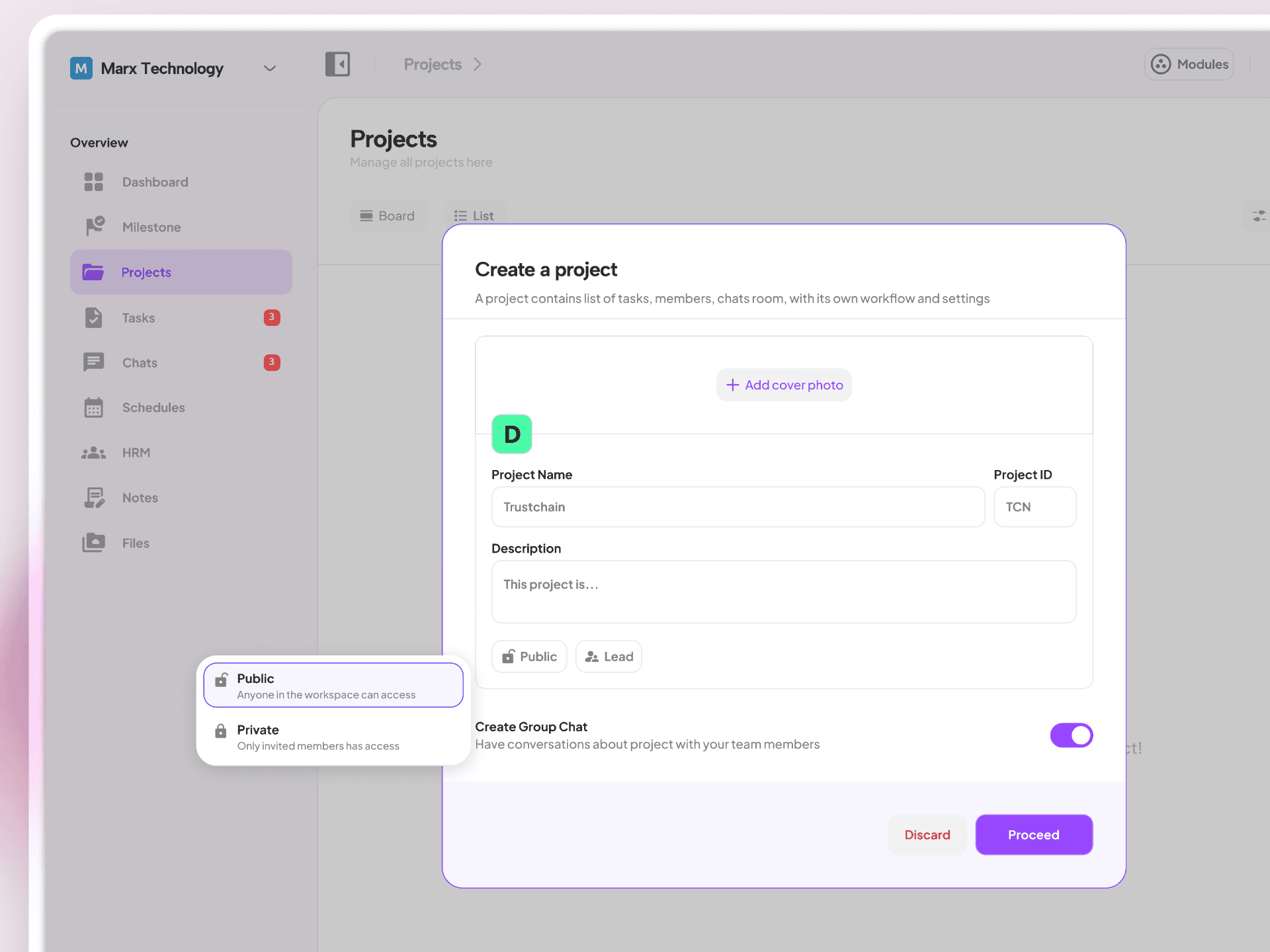 Visibility Controls: Toggle between public or private projects