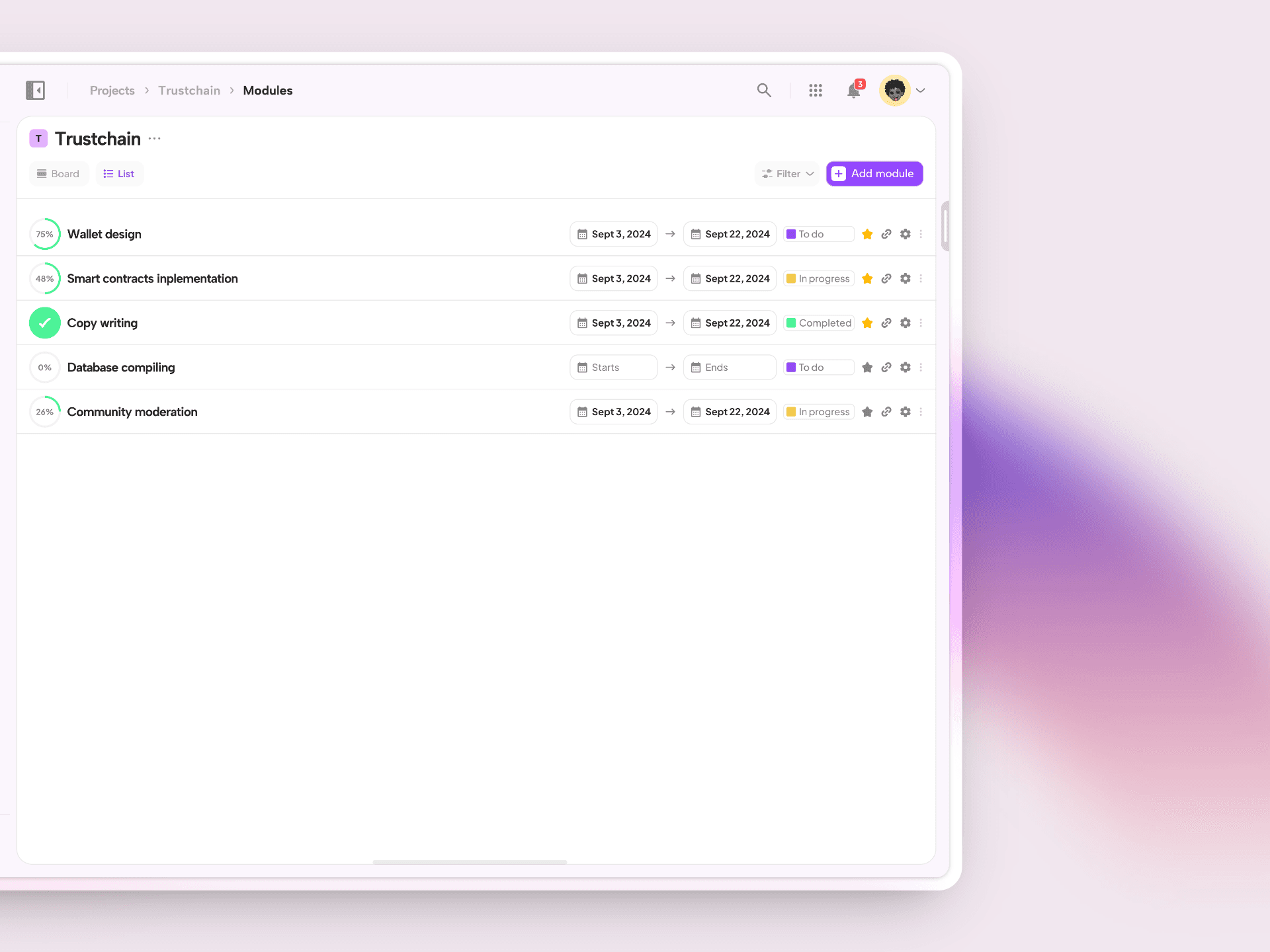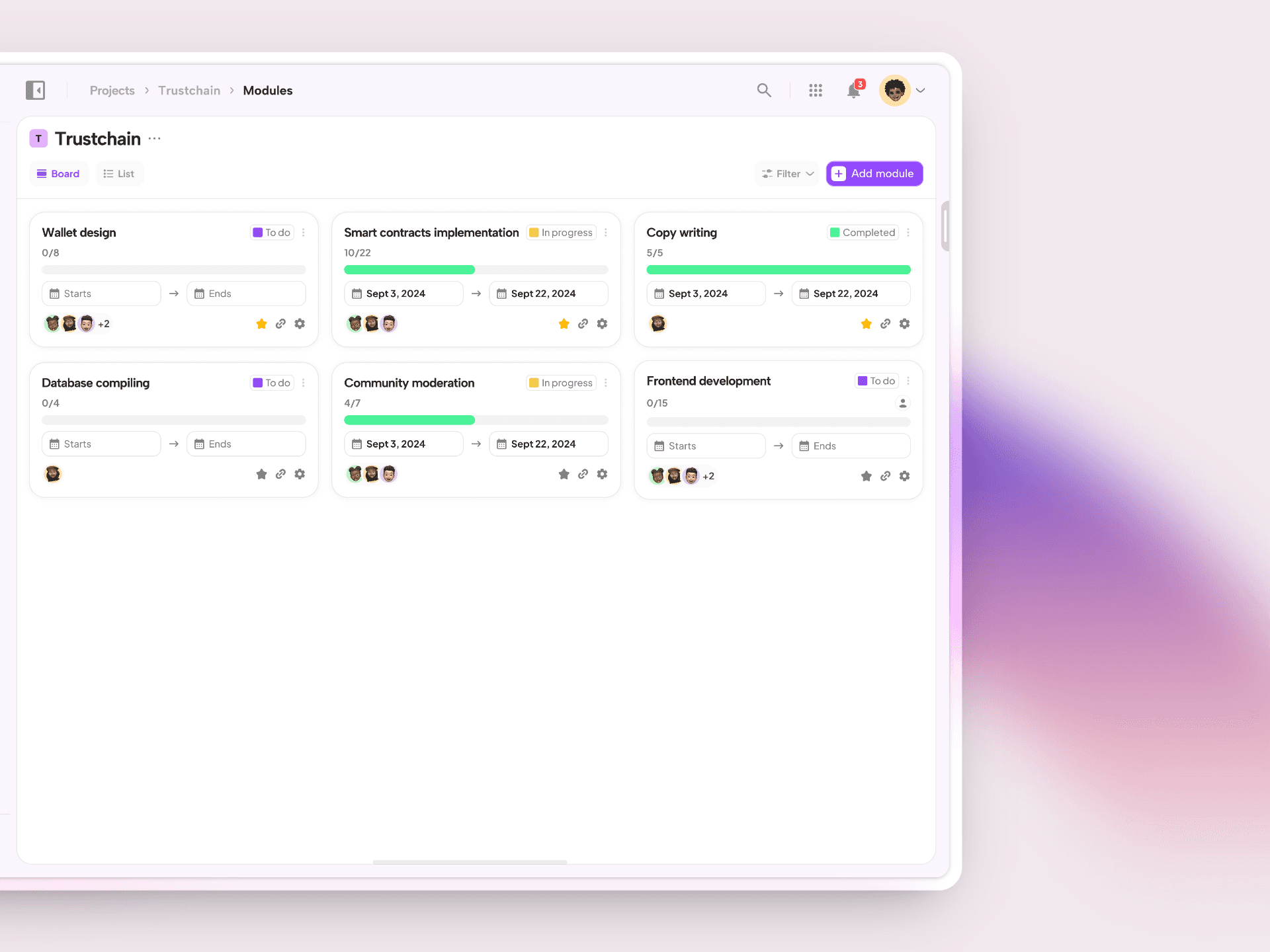 Color System: Neutral base tones with functional color accents purple for primary actions, green for progress indicators, red for urgency